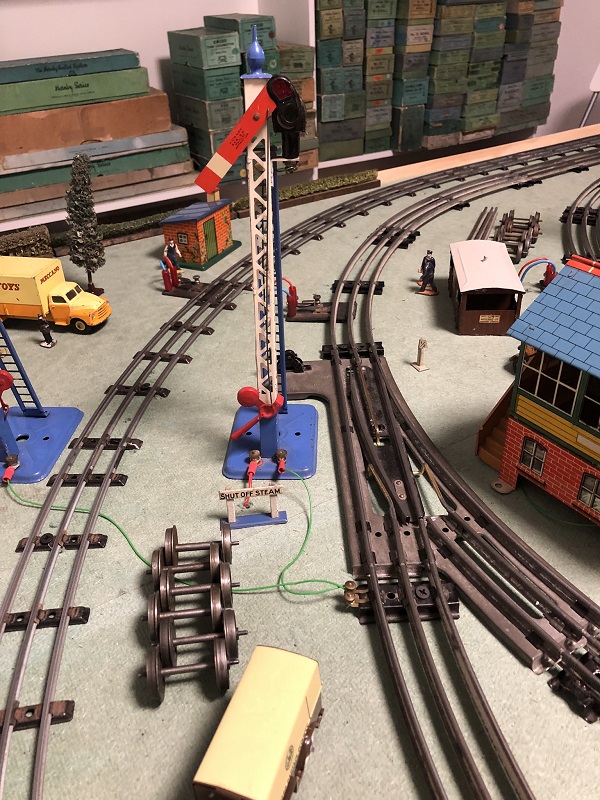 I like the tiny details of the vintage Hornby 0-gauge range. The electrical accessories, such as the No. 1E Single Arm Signal and the 2E Signal Cabin, are connected to the rails using the original Hornby earthing/bonding clips. For the Track Connecting Plates, I use the original red Meccano plugs.