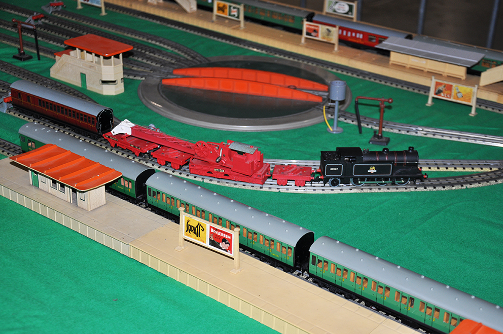 In the last week of October 2021 the large model railway show Eurospoor in Utrecht (Holland) was taking place. The Dutch Hornby Railway Collectors Association was also present with a Dublo and an 0 gauge tinplate layout. The day before the show Peter Zwakhals, Rob van Teylingen, Barend Westerveld and Hans van Dissel came together at Utrecht with 4 cars loaded with stuff. Rob got busy with his Hornby Dublo layout, while the rest started to build an 0 gauge empire. By 15.30h we had laid all the track, tested it and put up all the buildings, signals and other lineside goodies, so decided to call it a day. Early in the morning of the show the trains were unpacked and after finishing touches to the layouts the public could see what classic trains are all about. During the show we had a lot of questions to answer and some people were quite surprised to hear that Hornby, Dinky Toys and Meccano were all made by the same firm!