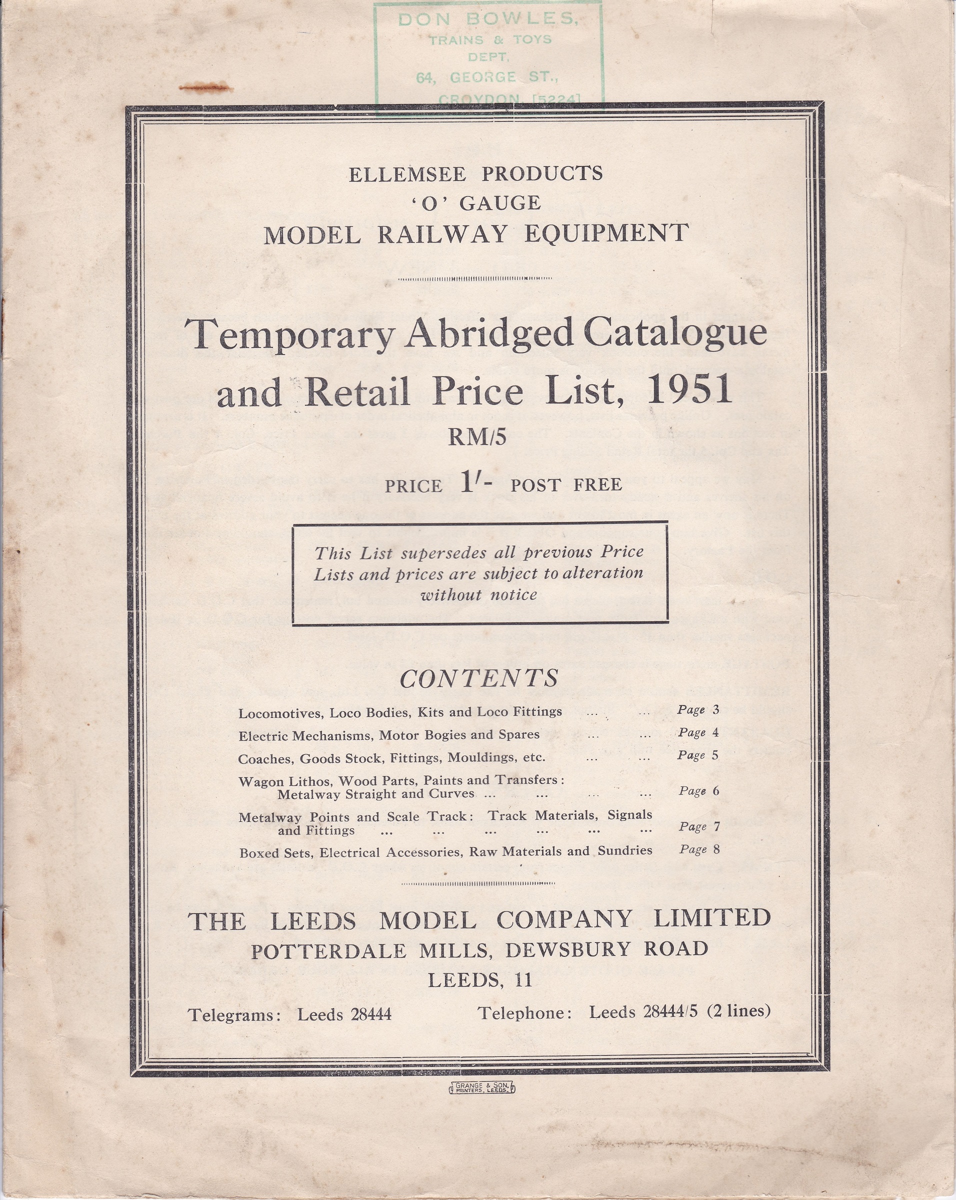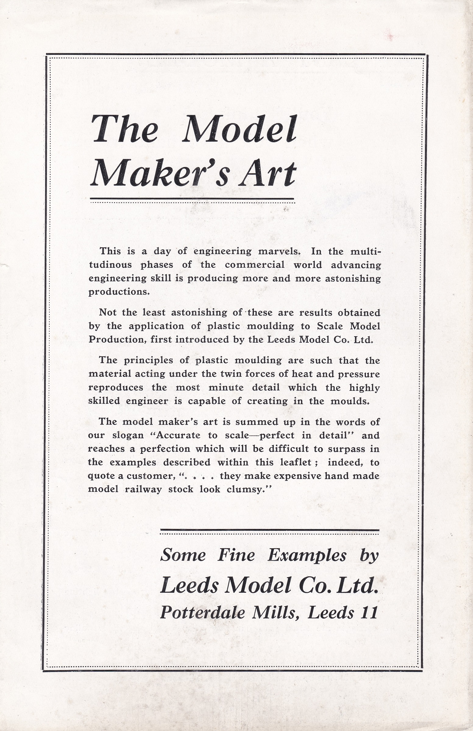 This page displays the covers of most of the catalogs and leaflets published by the Leeds Model Company. Sometimes a cover was used for several years or different versions were released in a single season with the cover unchanged. In those cases the page where the distinction is most clearly made is shown alongside the cover.